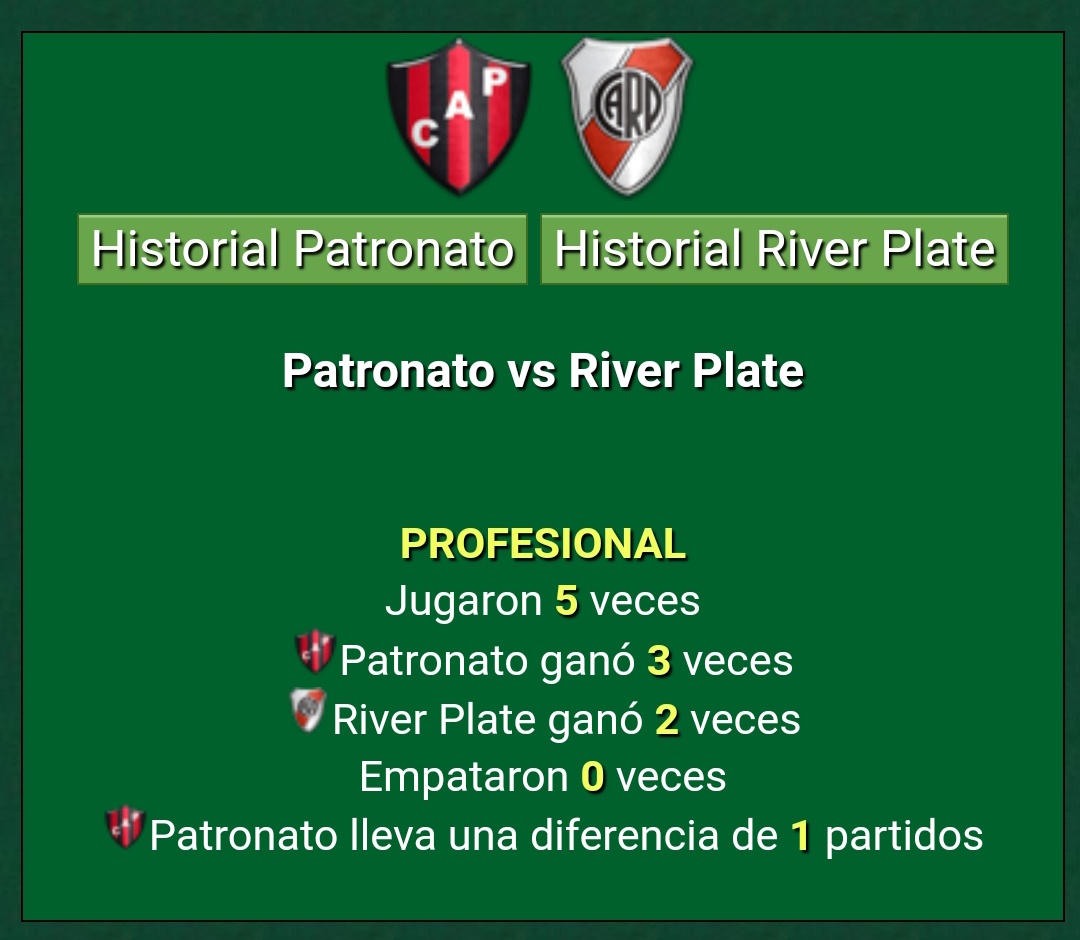 Patronato 2-1 River Plate Liga Profesional. El partido presenta una particularidad en su corto historial ya que Patronato supera a River luego de haberse enfrentado cinco veces con tres triunfos contra dos ya que ganó en Núñez por 3-1. History River Plate vs Patronato In total the two teams have met 7 times Patronato dominates the record with 4 wins there have been no draws and River has won 3 matches.